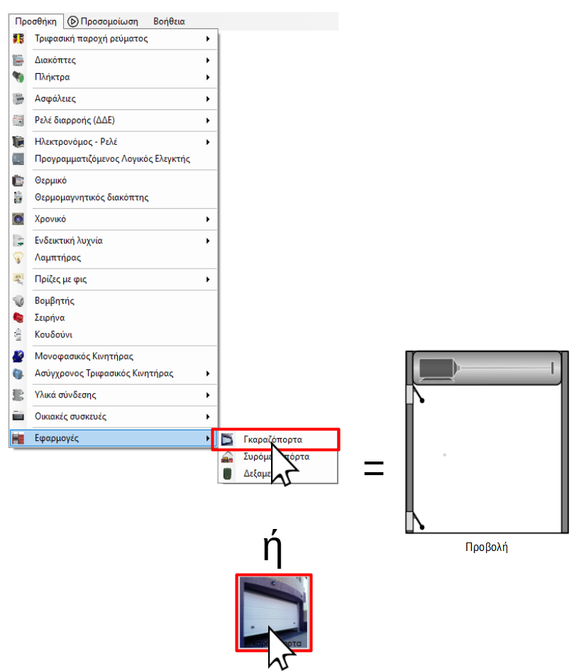 Για να προσθέσετε μια γκαραζόπορτα μπορείτε να χρησιμοποιήσετε το μένου "Προσθήκη" ή την εργαλειοθήκη, όπως φαίνεται στις παρακάτω εικόνες:
