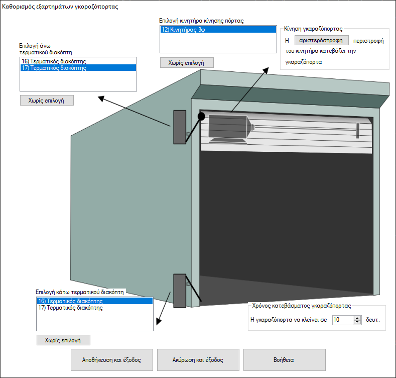 Στο επάνω δεξί μέρος του παραθύρου υπάρχει μια λίστα με τίτλο "Επιλογή κινητήρα κίνησης πόρτας". Η λίστα περιέχει όλους τους κινητήρες (ΑΜΚ & ΑΤΚ) του κυκλώματος. Μπορείτε να επιλέξετε τον κινητήρα που θα θέλατε αναλάβει την κίνηση της γκαραζόπορτας. Αν θέλετε η γκαραζόπορτα να λειτουργήσει δίχως κινητήρα τότε μπορείτε να πίεσετε το πλήκτρο "Χωρίς επιλογή" που βρίσκεται ακριβώς από κάτω, να ξέρετε όμως ότι έτσι η γκαραζόπορτα σας δεν θα κινείται.