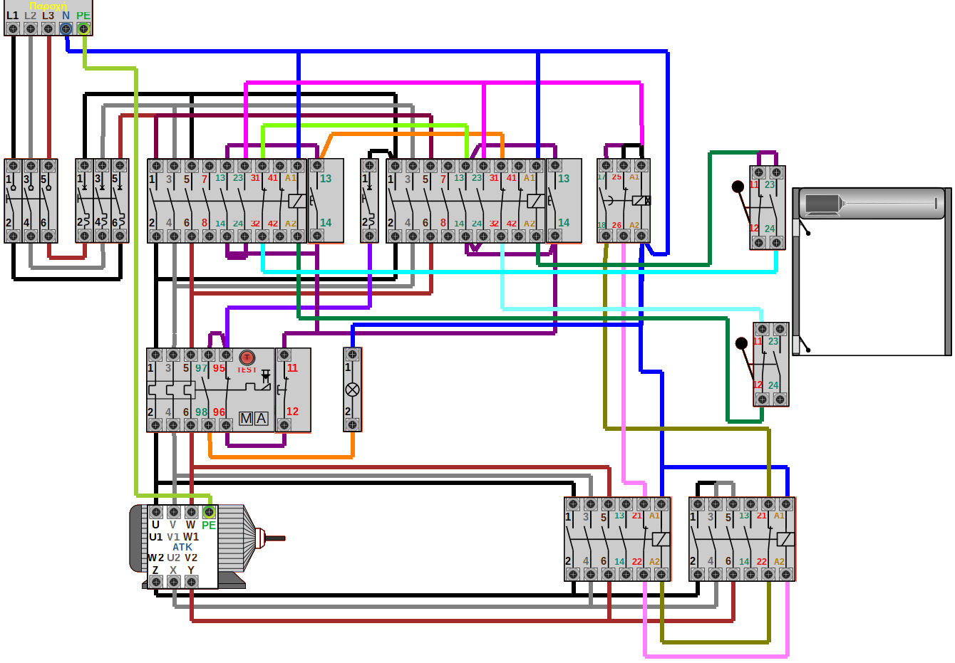 Κύκλωμα αυτοματισμού συρόμενης πόρτας με αναστροφή φοράς περιστροφής και ΥΔ και δύο τερματικούς