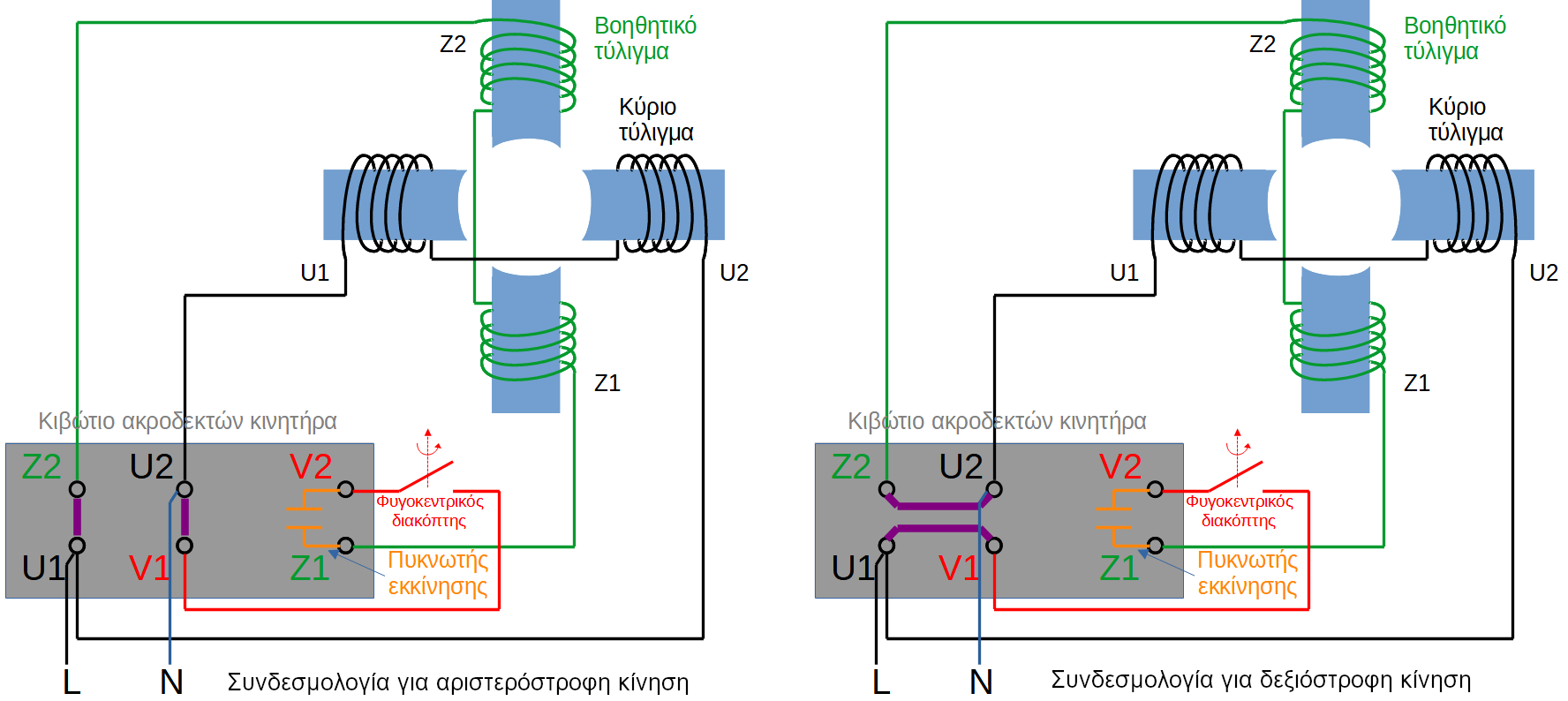 Για να αλλάξει η φορά περιστροφής του κινητήρα θα πρέπει να αλλάξει η σύνδεση του βοηθητικού τυλίγματος σε σχέση με το κύριο. Αυτό επιτυγχάνεται με τον παρακάτω τρόπο:
