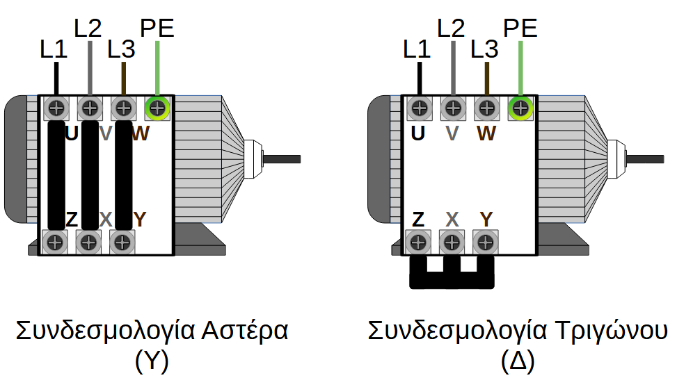 Στο κιβώτιο συνδέσεων του κινητήρα θα παρατηρήσουμε τα παραπάνω άκρα μαζί με το άκρο της γείωσης (PE) που χρησιμοποιείται για την γείωση του σώματος του κινητήρα.