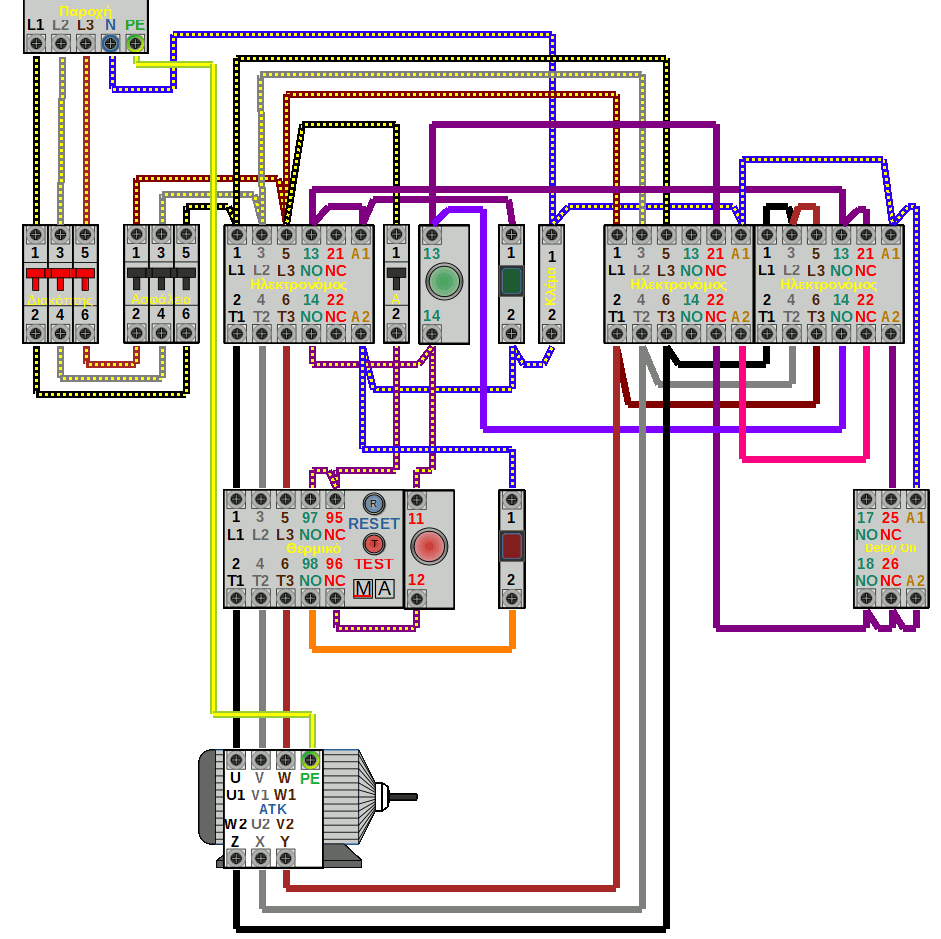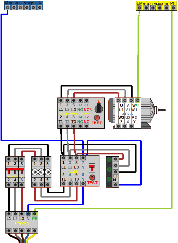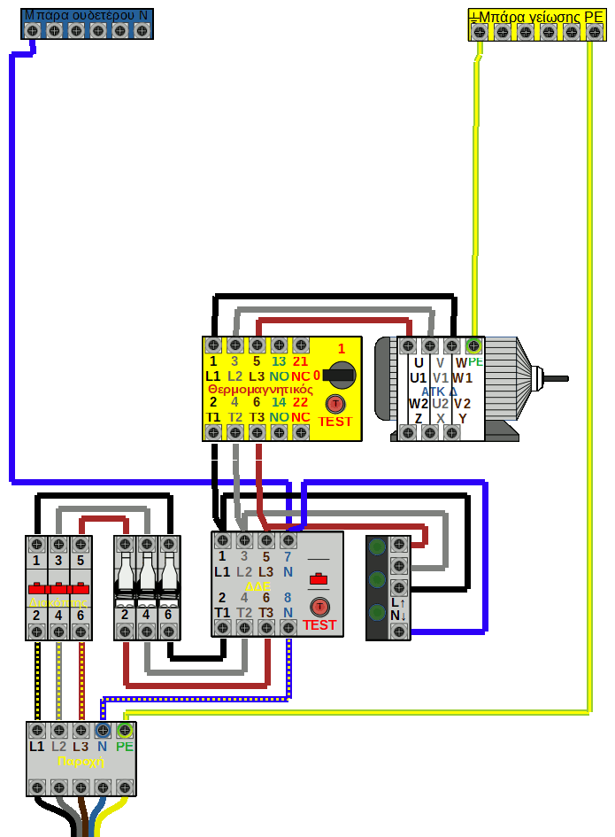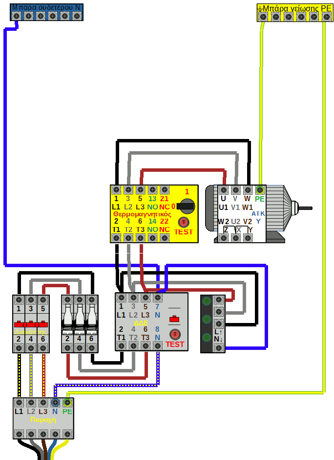 Στην εφαρμογή είναι διαθέσιμα προς σύνδεση μόνο τα άνω άκρα, δηλαδή τα U1, V1, W1 και φυσικά το άκρο της γείωση PE.