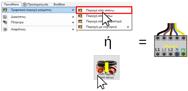 Η γραμμή της παροχής μπορεί να έρχεται από επάνω, από κάτω και από αριστερά. Για να προσθέσετε ένα εξάρτημα παροχής μπορείτε να χρησιμοποιήσετε το μένου "Προσθήκη" ή την εργαλειοθήκη, όπως φαίνεται στις παρακάτω εικόνες: