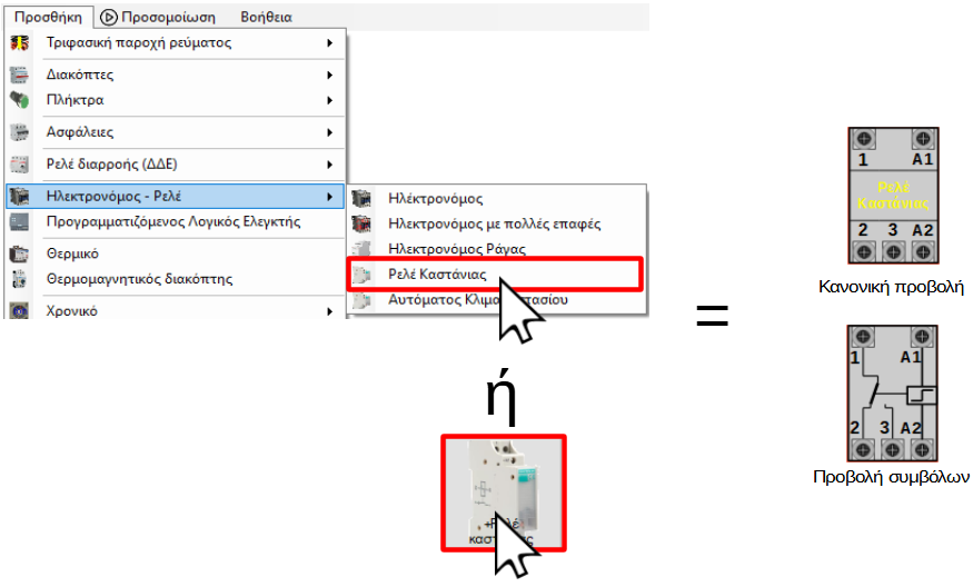 Για να προσθέσετε ένα ρελέ καστάνιας μπορείτε να χρησιμοποιήσετε το μένου "Προσθήκη" ή την εργαλειοθήκη, όπως φαίνεται στις παρακάτω εικόνες: