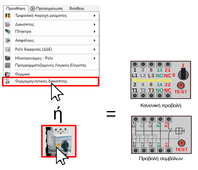 Για να προσθέσετε έναν θερμομαγητικο διακόπτη μπορείτε να χρησιμοποιήσετε το μένου "Προσθήκη" ή την εργαλειοθήκη, όπως φαίνεται στις παρακάτω εικόνες: