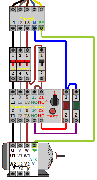 Παρακάτω φαίνεται η συνδεσμολοία του θερμομαγνητικού διακόπτη για την τροφοδοσία τριφασικού και μονοφασικού κινητήρα.