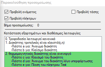 Οι υπόλοιπες διαθέσιμες λειτουργίες του θερμομαγνητικού διακόπτη εκτελούνται με τη βοήθεια των πλήκτρων ενεργειών. Για να δείτε ποιά πλήκτρα αντιστοιχούν σε ποιές ενέργειες θα πρέπει να βρείτε την καταχώρηση για τον θερμομαγνητικό διακόπτη στο παράθυρο "Παρακολούθηση της προσομοίωσης" (βρίσκεται στα δεξιά του παραθύρου "Προσομοιωτής"). Παρακάτω δίνεται ένα σχετικό παράδειγμα:
