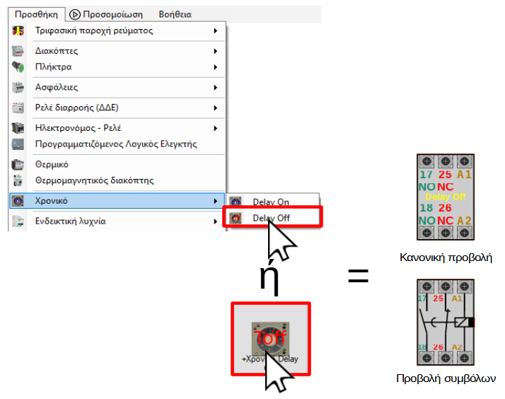 Για να προσθέσετε έναν χρονικό Delay Οff μπορείτε να χρησιμοποιήσετε το μένου "Προσθήκη" ή την εργαλειοθήκη, όπως φαίνεται στις παρακάτω εικόνες: