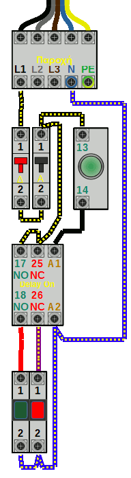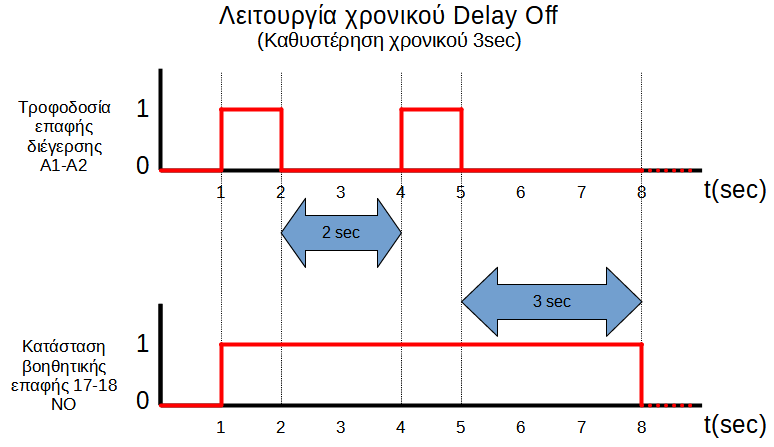 Αν σταματήσει η τροφοδοσία της επαφής διέγερσης Α1-Α2 πριν προλάβει να παρέλθει το προκαθορισμένο χρονικό διάστημα τότε δεν αλλάζει η κατάσταση των επαφών.