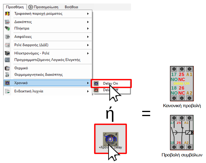 Για να προσθέσετε έναν χρονικό Delay Οn μπορείτε να χρησιμοποιήσετε το μένου "Προσθήκη" ή την εργαλειοθήκη, όπως φαίνεται στις παρακάτω εικόνες: