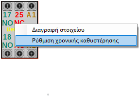Για να ρυθμίσετε τον χρόνο καθυστέρησης του χρονικού θα πρέπει, κατά την επεξεργασία του κυκλώματος, να κάνετε δεξί κλικ επάνω στο χρονικό, στο αναδυόμενο μενού που θα εμφανιστεί θα πρέπει να επιλέξετε "Ρύθμιση χρονικής καθυστέρησης" όπως φαίνεται στην παρακάτω εικόνα: