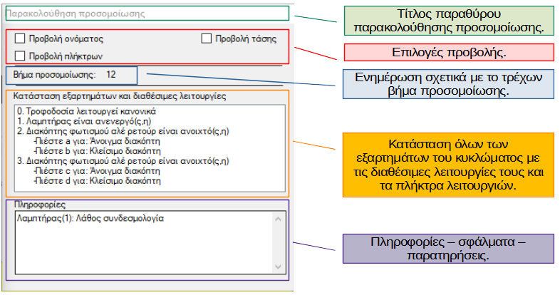 Μέρη του παραθύρου παρακολούθησης της προσομοίωσης