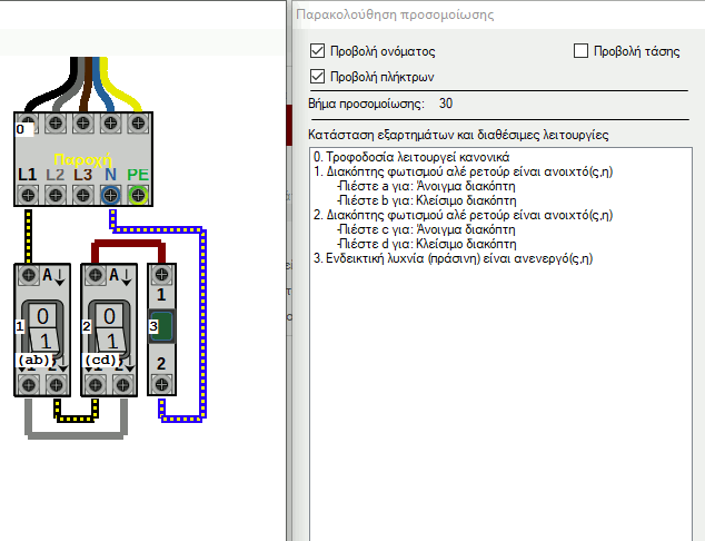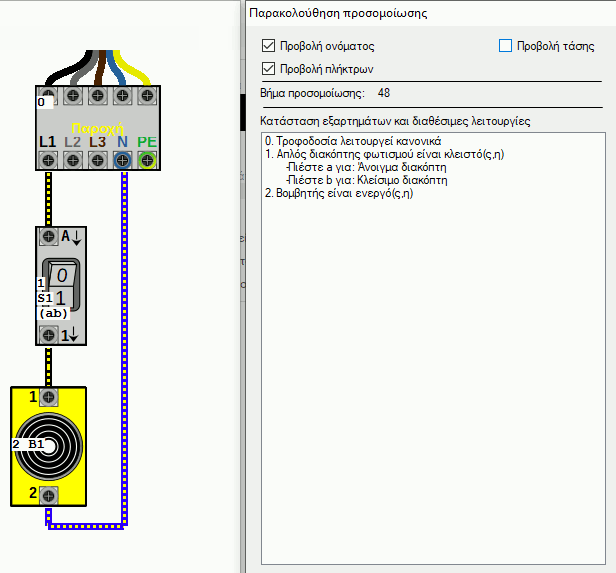 Μόλις ξεκινήσει η προσομοίωση θα παρατηρήσετε ότι όλοι οι ρευματοφόροι αγωγοί αλλάζουν χρωματισμό (στο εσωτερικό τους εμφανίζεται μια κίτρινη διακεκόμμενη γραμμή), όπως φαίνεται παρακάτω: