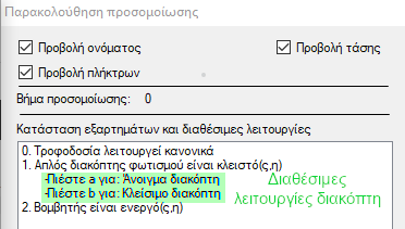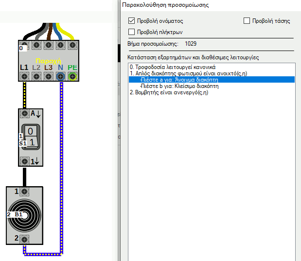 Παρατηρήστε στην παραπάνω εικόνα με τίτλο "Διαθέσιμες λειτουργίες διακόπτη" ότι για κάθε λειτουργία η εφαρμογή ζητά να πιέσετε ένα πλήκτρο. Στο παραπάνω παράδειγμα σας ενημερώνει ότι αν πιέσετε το πλήκτρο 'a' θα ανοίξει ο διακόπτης και αν πιέσετε το πλήκτρο 'b' θα κλείσει ο διακόπτης. Σημειώστε ότι τα ίδια πλήκτρα εμφανίζονται επάνω στο κάθε εξάρτημα αν ενεργοποιήσετε την 'Προβολή πλήκτρων'.