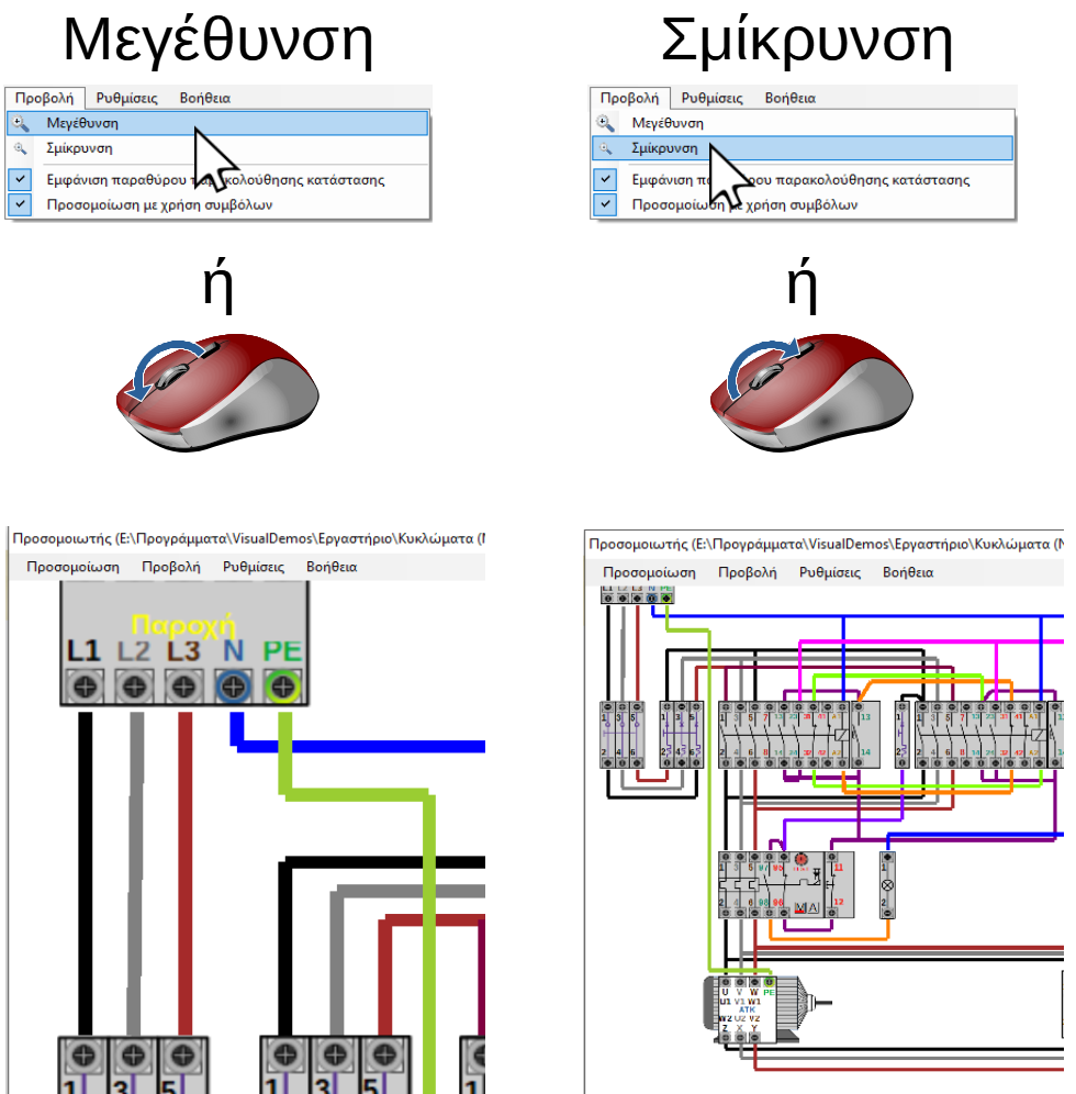 Κάνοντας κλικ επάνω στην επιλογή "Μεγέθυνση" ή γυρνώντας το ροδάκι του ποντικιού προς τα μπροστα αυξάνεται η μεγέθυνση προβολής του κυκλώματος.